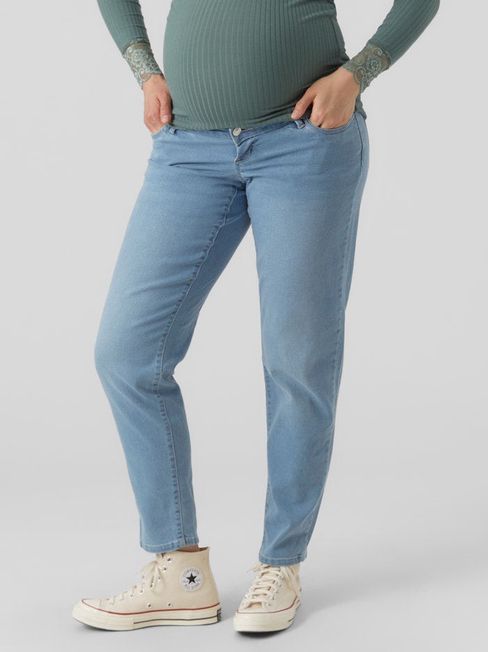 Bleib cool in einer Umstandsjeans, die du in jeder Phase deiner Schwangerschaft tragen kannst und die deinen Bauch mit einem elastischen Bauchband stützt.