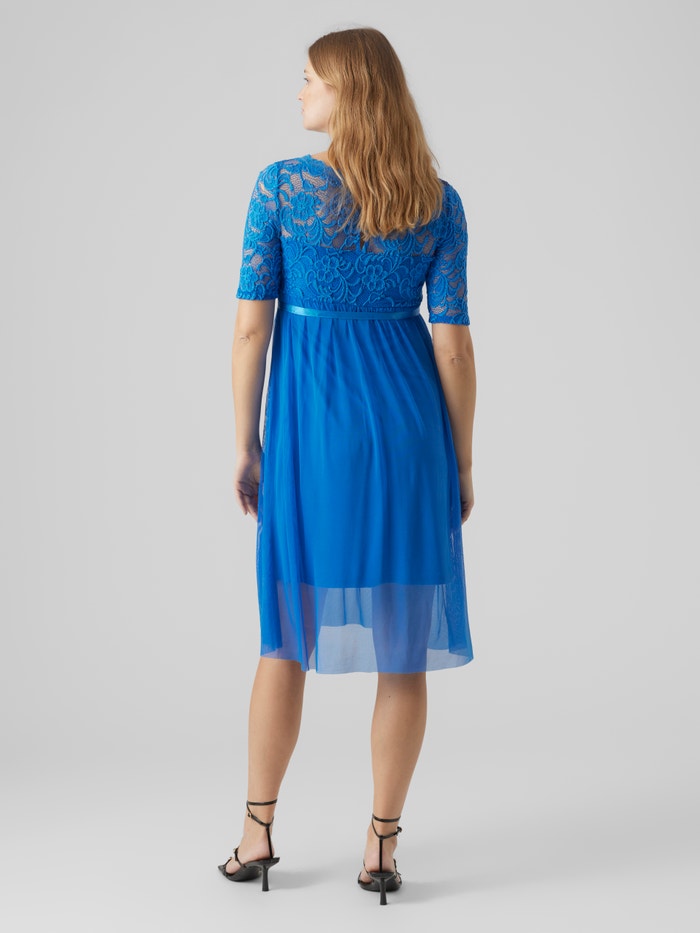 LADIES MATERNITY A-SHAPE DRESS. 3/4 LACE SLEEVES WITHOUT LINING WITH SCALLOP EDGE. BOAT NECK WITH LACE EDGE. LINING INSIDE DRESS AND UPPER PART OF BODY WITHOUT LINING. CUTLINE ABOVE BELLY AND GATHERINGS UNDER THE CUTLINE. ZIPPER AT SIDESEAM. A SATIN WEAVE BELT.