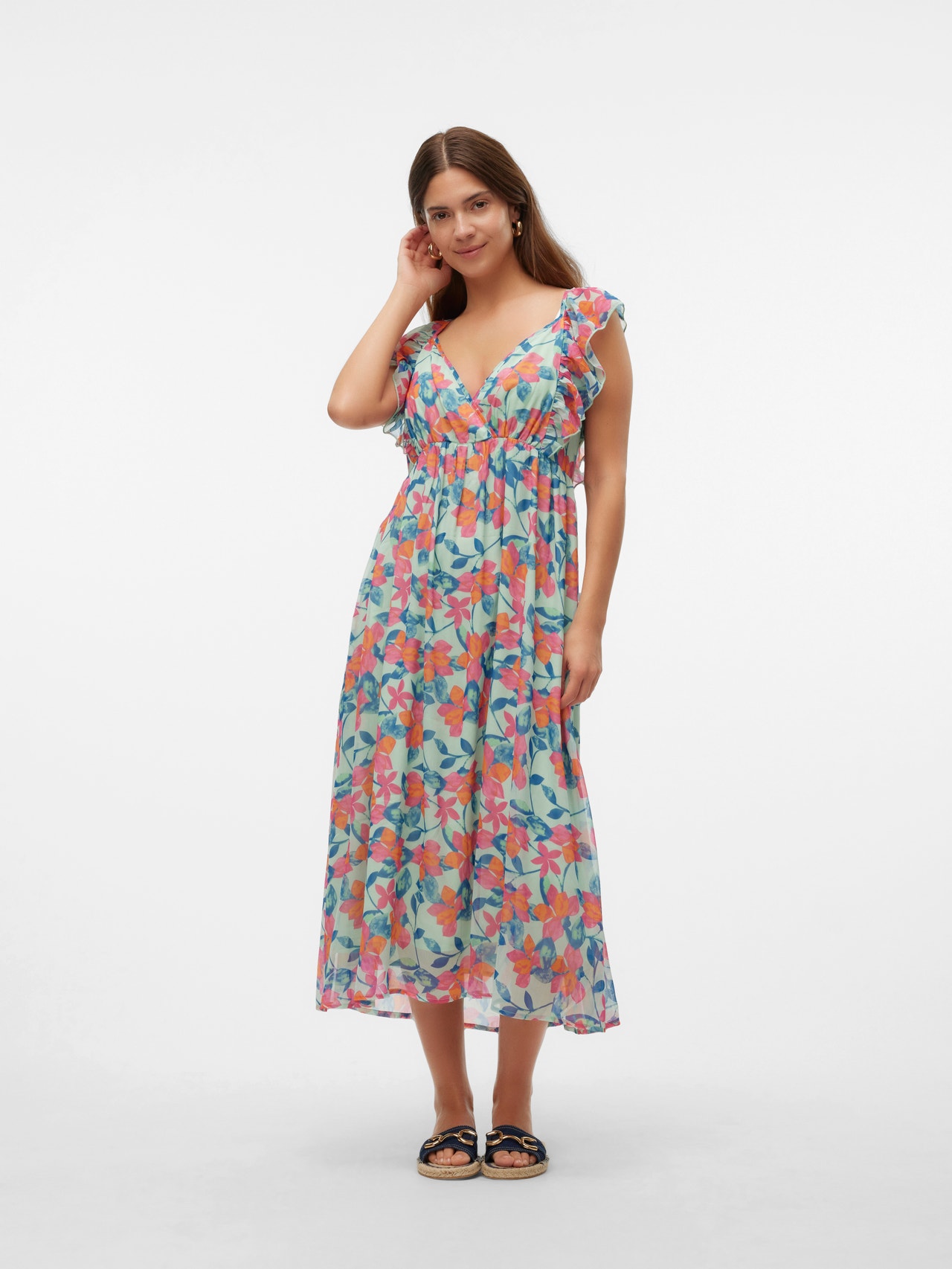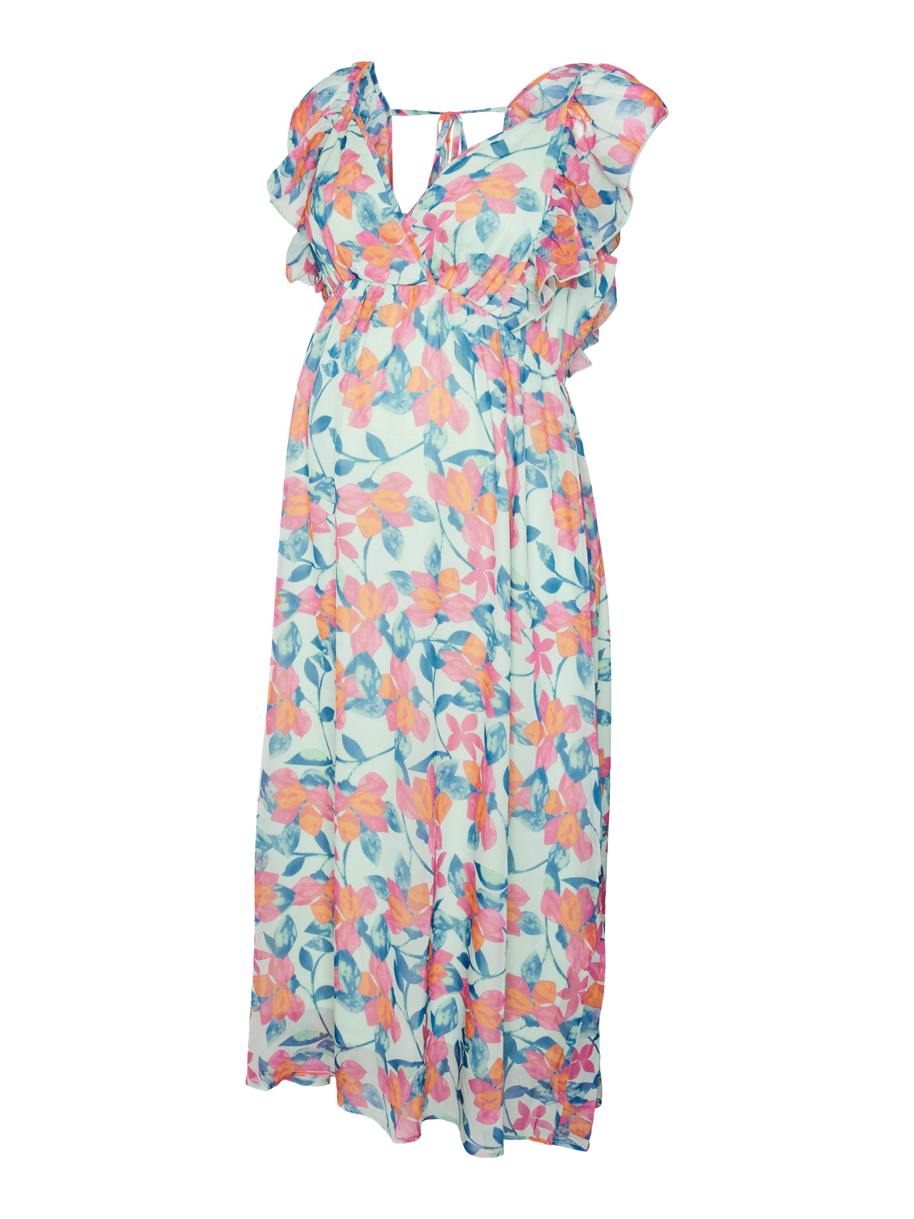 Create a stunning look with party styles that ensure comfort and elegance, perfect for both small and large celebrations all year round. - Product Type : Party dress - Neck : V-Neck - Sleeve : Sleeveless - Closing : String fastening - Length/Size : Midi length - Lining : Viscose lining for a soft feel and a non-static layer - Extra details : Cutline above bump, Frills, Smock detail - Print : Print repeated across the entire surface of the product - Fit : Regular Fit