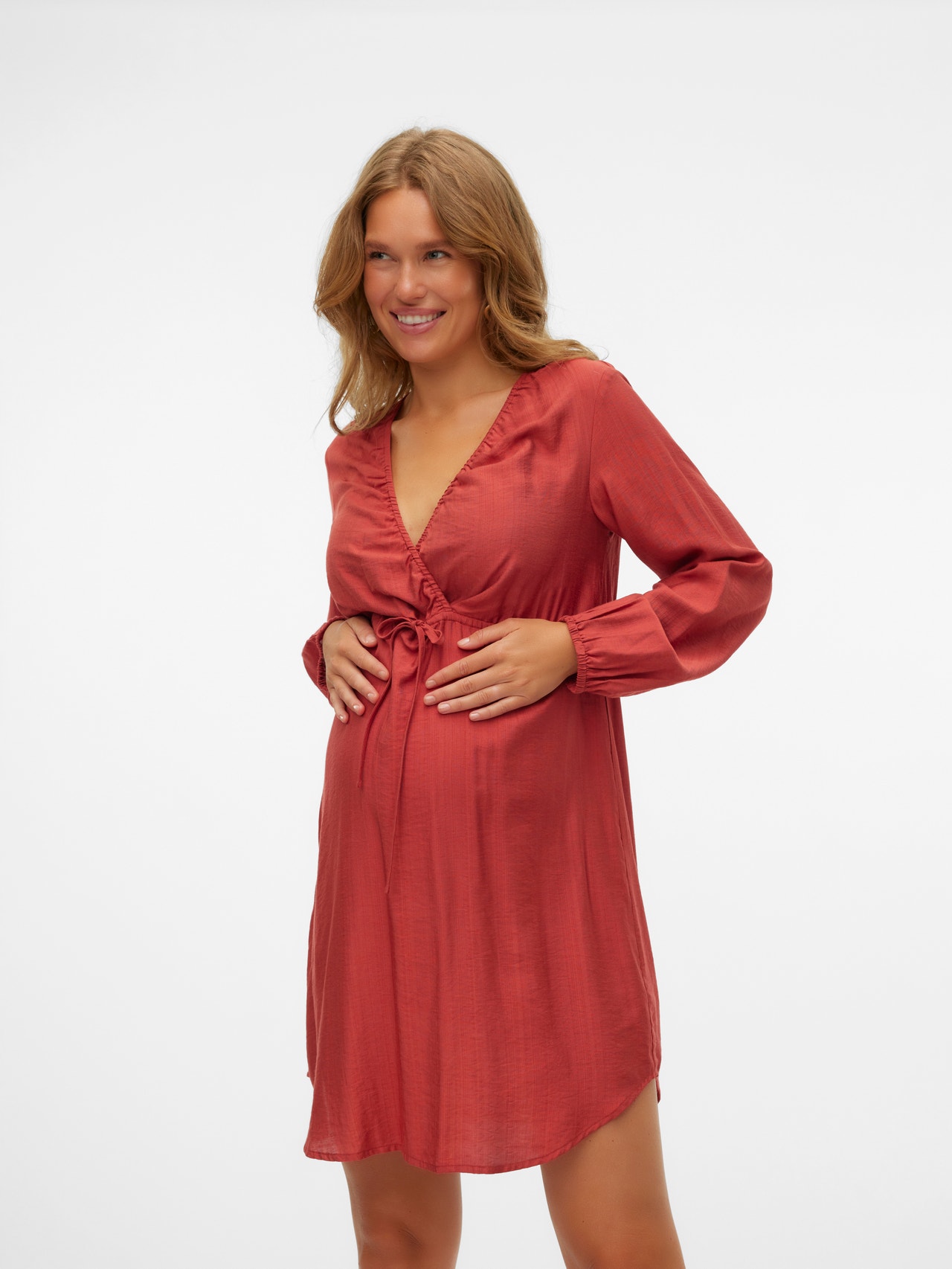 Add comfort and colour to your wardrobe with beautiful 2-in-1 dresses for both pregnancy and nursing. - Product Type : Dress - Neck : V-Neck - Sleeve : Long sleeves - Cuffs : Elasticated cuffs - Closing : Drawstring fastening - Length/Size : Short - Extra details : Cutline above bump, Elasticated waist, Pleated detail, Nursing layer under a wrapped effect - Fit : Regular Fit