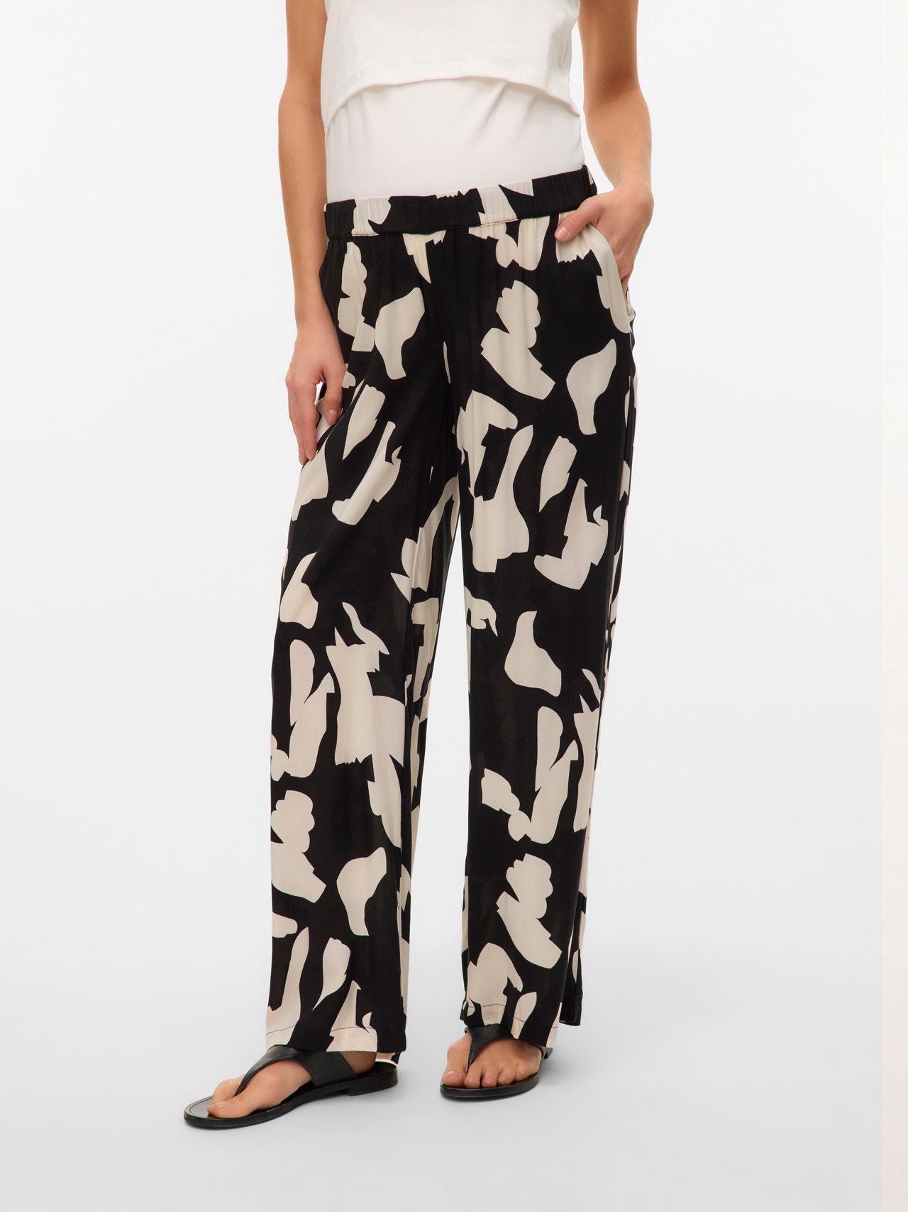Find the perfect pair of trousers designed to fit through all stages of pregnancy and dress for both everyday activities and festive occasions. - Product Type : Wide-leg trousers - Pockets : Side pockets - Extra details : Elastic inside waist, Bump band under the bump for extra comfort - Print : Print repeated across the entire surface of the product - Fit : Regular Fit