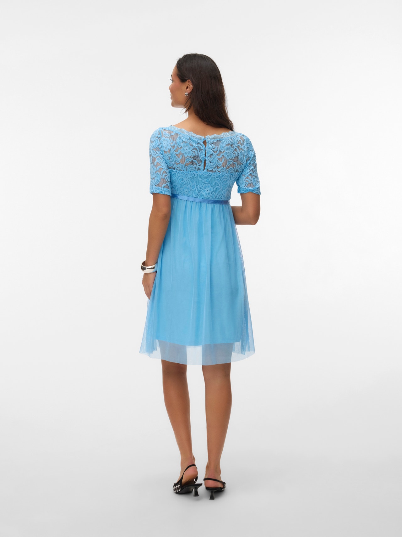 LADIES MATERNITY A-SHAPE DRESS. 3/4 LACE SLEEVES WITHOUT LINING WITH SCALLOP EDGE. BOAT NECK WITH LACE EDGE. LINING INSIDE DRESS AND UPPER PART OF BODY WITHOUT LINING. CUTLINE ABOVE BELLY AND GATHERINGS UNDER THE CUTLINE. ZIPPER AT SIDESEAM. A SATIN WEAVE BELT.