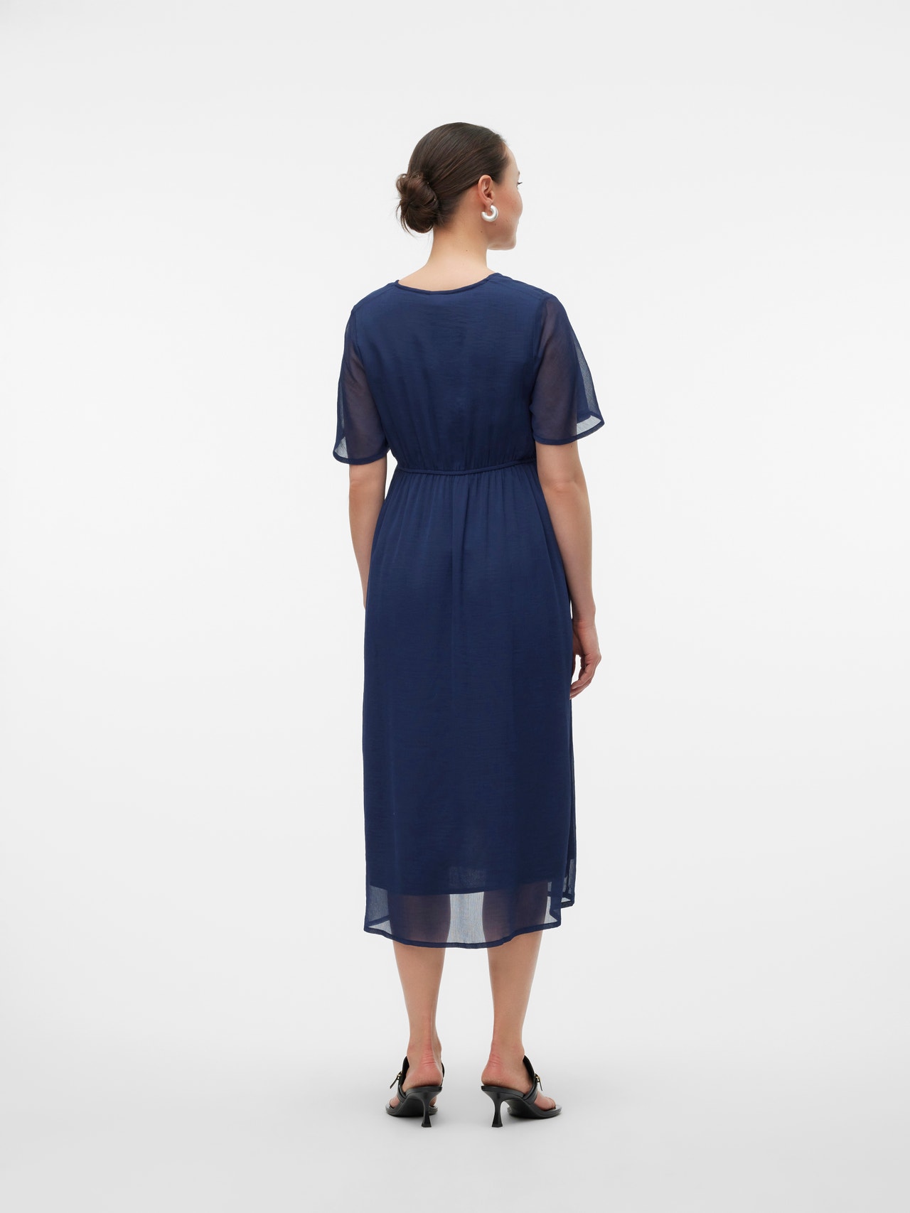 - Detaljer : Buet fald, Snittlinje over magen, Innsnitt, Elastisk linning, Plissert detalj