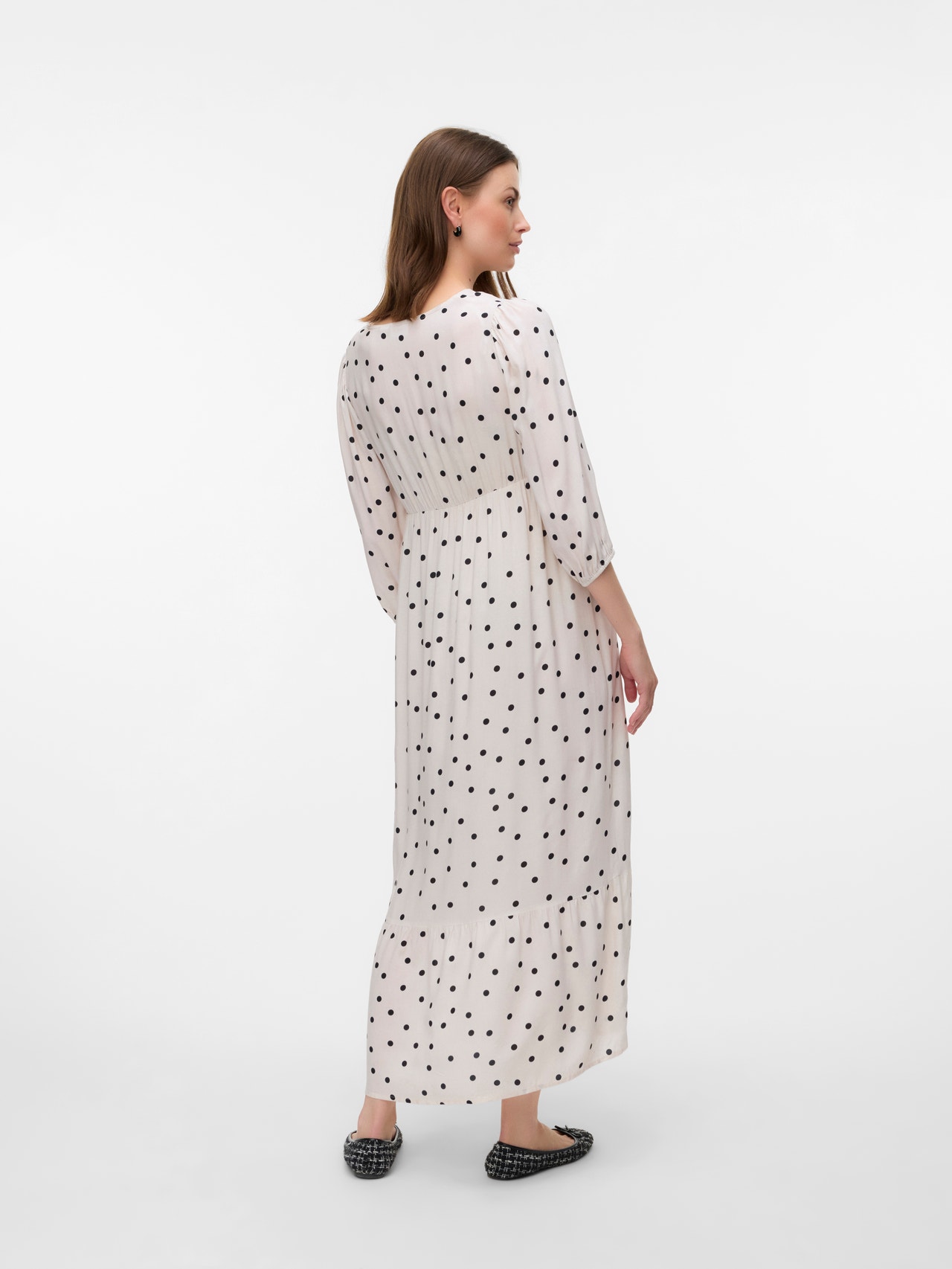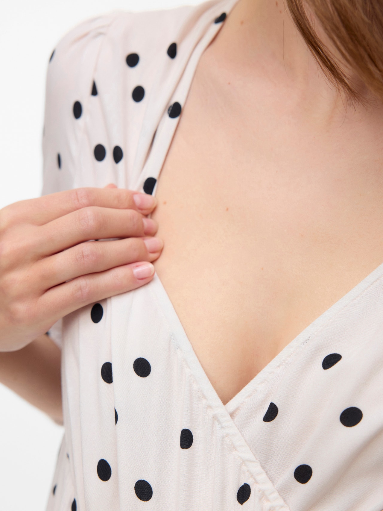 - Detaljer : Buet fald, Snittlinje over magen, Innsnitt, Elastisk linning, Ammelag under en omslagseffekt