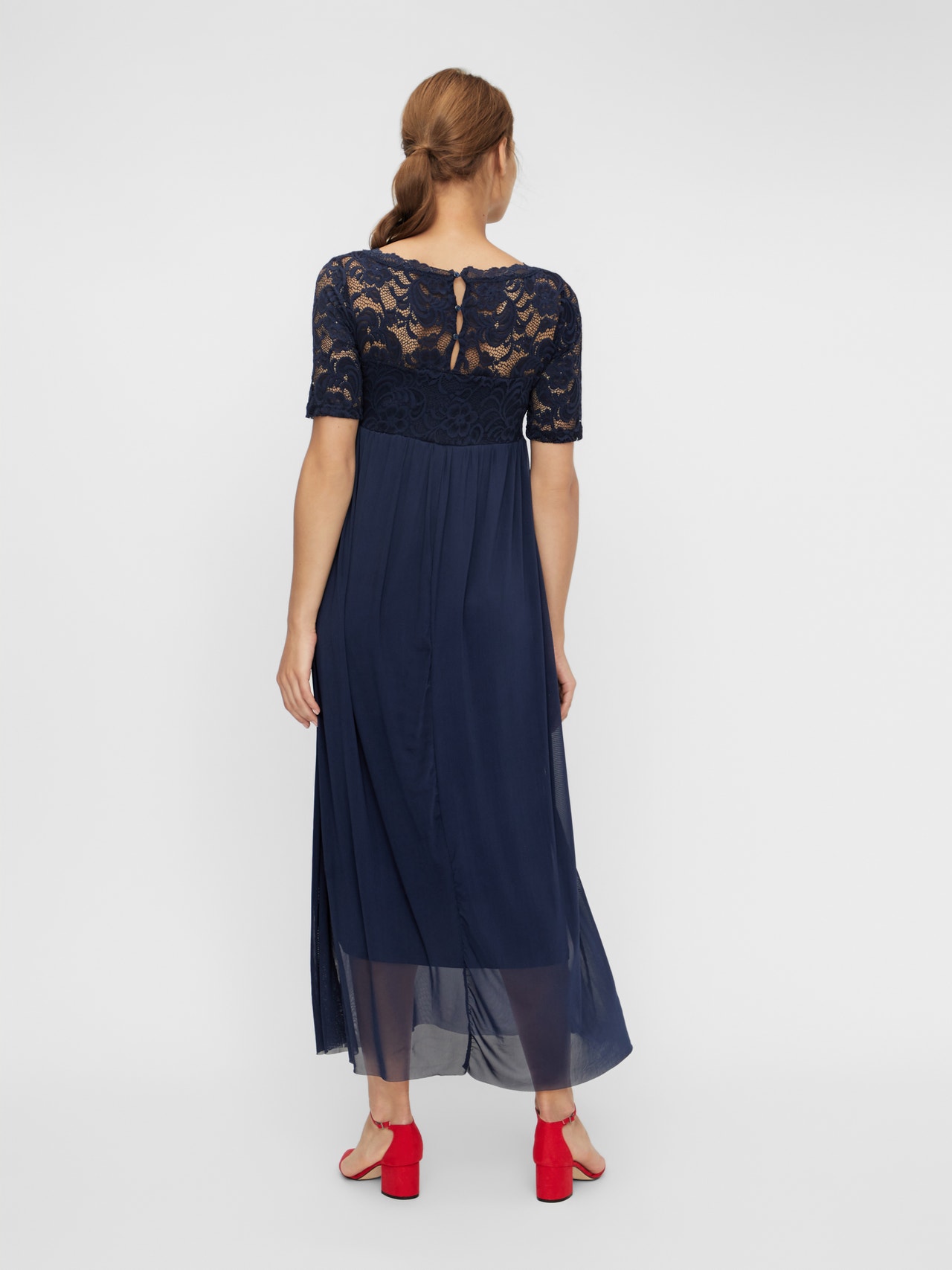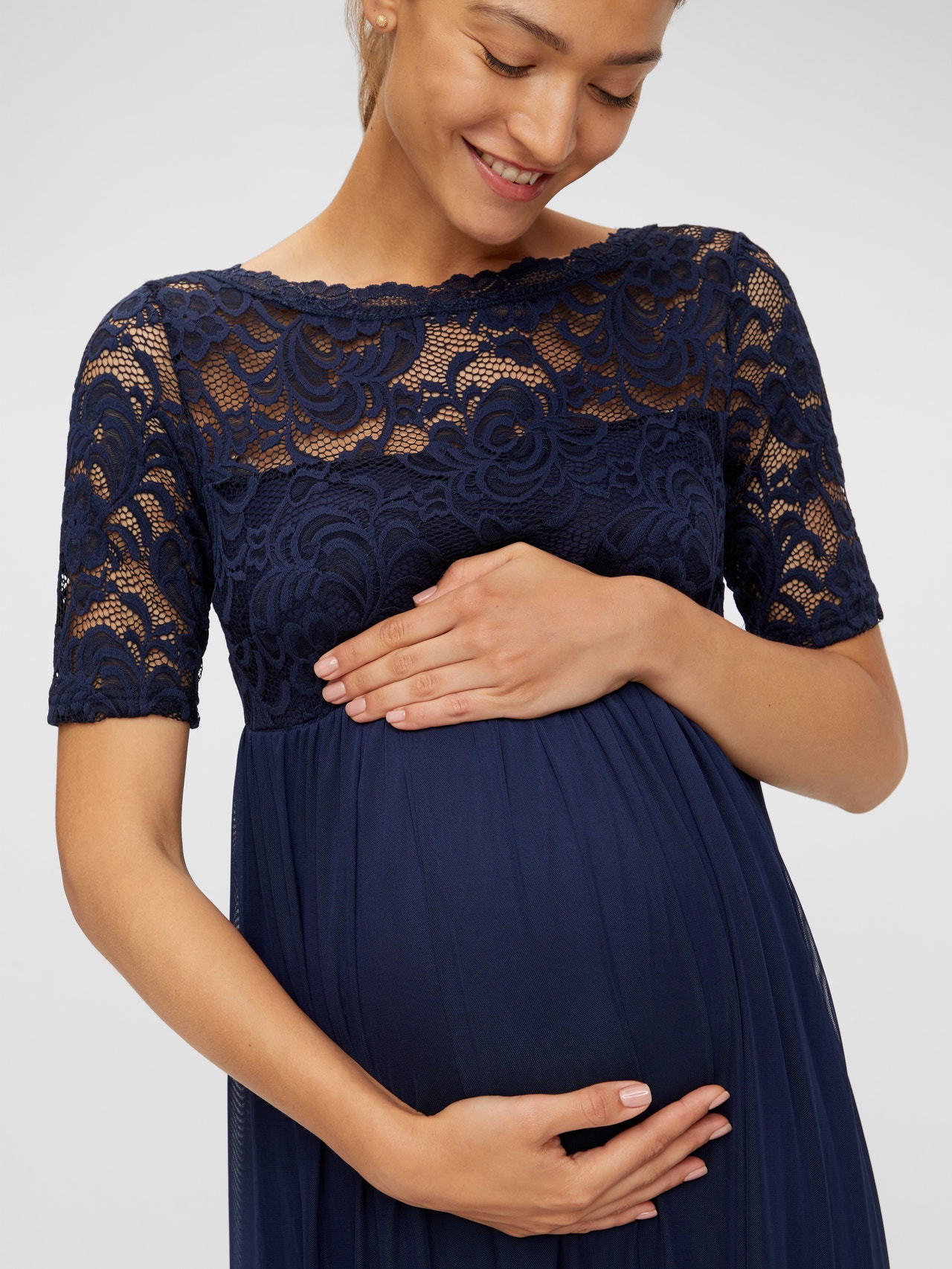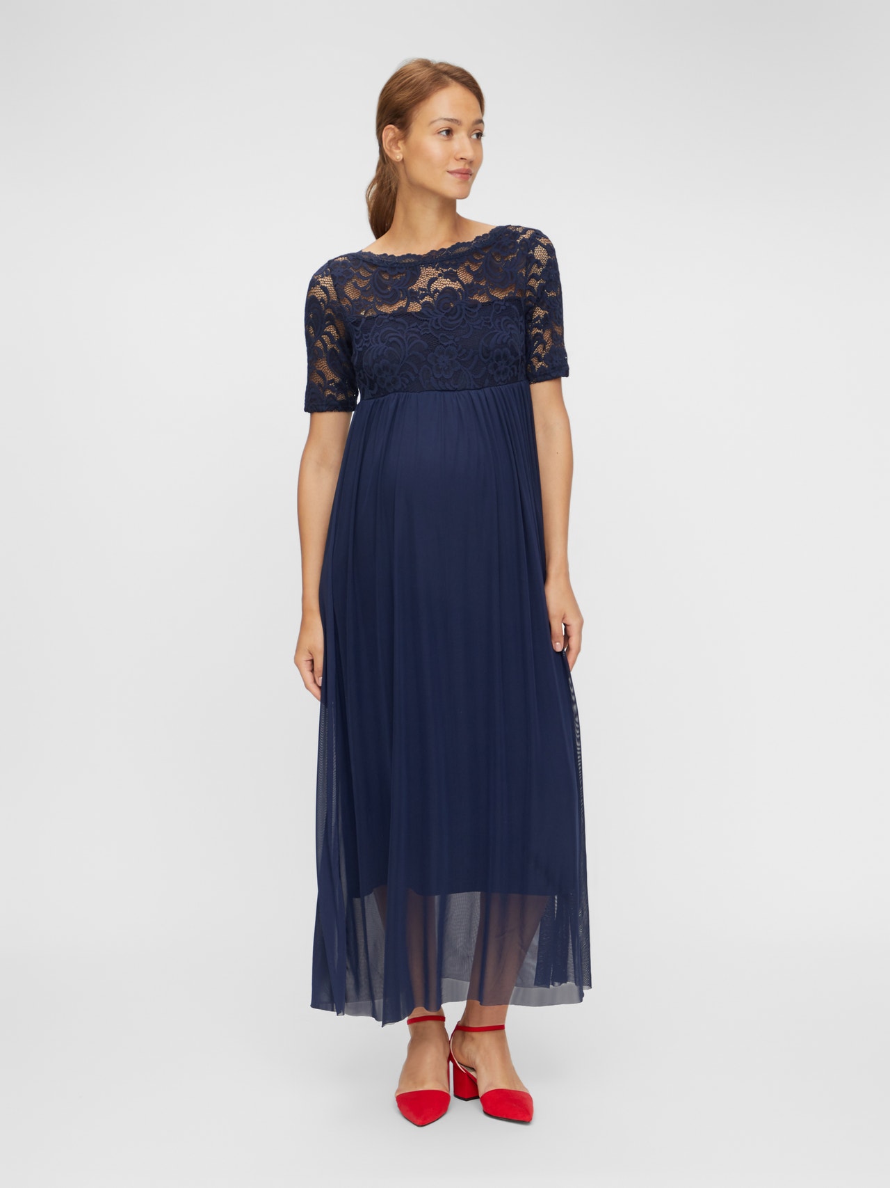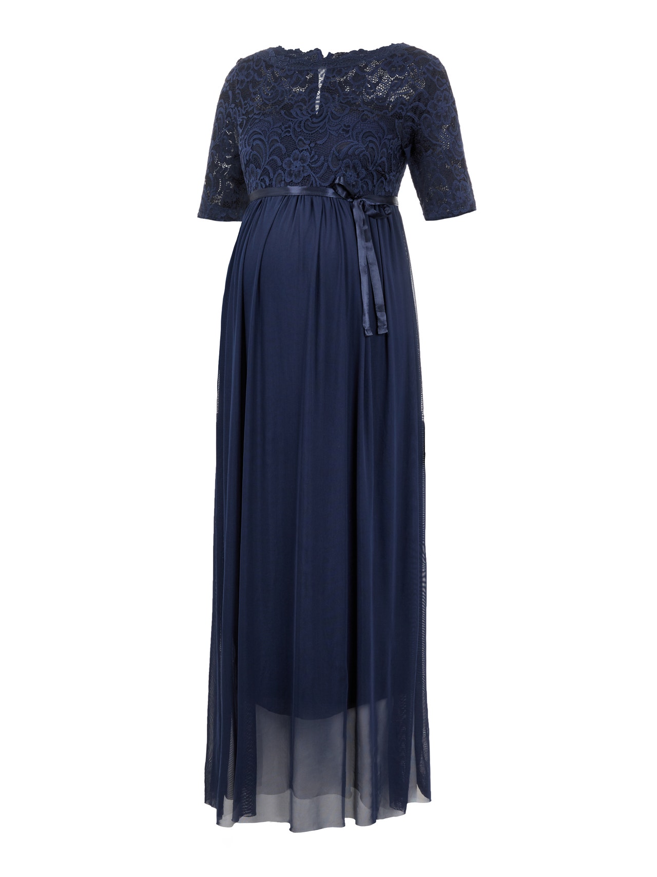 LADIES MATERNITY A-SHAPE DRESS. 2/4LACE SLEEVES WITHOUT LINING WITH SCALLOP EDGE. BOAT NECK WITH LACE EDGE. LINING AT SKIRT AND HALF OF UPPER BODY. CUTLINE ABOVE BELLY AND GATHERINGS BELOW CUTLINE. ZIPPER AT SIDESEAM. WITH SATIN WEAVE BELT.